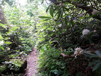 I had planned to turn around at 3 hours. At 2.5 though I hit a thick grove of Rhododendren. They were plentiful all along trail and up the hill. The blooms were dying and mostly fallen off. But in this spot there were still quite a bit and the bees buzzing in my ear were getting on my nerves. Plus I lost the blazes. So I decided it was as good a time as any to turn around.